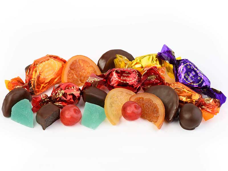 Fruta confitada (Contiene SULFITOS) (fruta variada troceada, azúcar, jarabe de glucosa y fructosa, conservadores (bisulfito sódico, sorbato potásico y ácido cítrico) y colorantes (E-100, E-120, E133)) y Cobertura de grasa vegetal (azúcar, grasa vegetal de girasol y coco hidrogenada, LACTOSUERO en polvo, cacao en polvo, emulgente: lecitina de SOJA y aroma). Puede contener trazas de gluten y frutos de cáscara