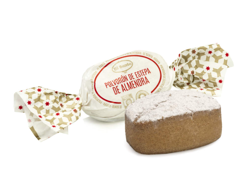 Auténtico Polvorón de Estepa con Almendras seleccionadas envuelto en papel seda a moño. Producto amparado por nuestra IGP “Polvorones de Estepa”