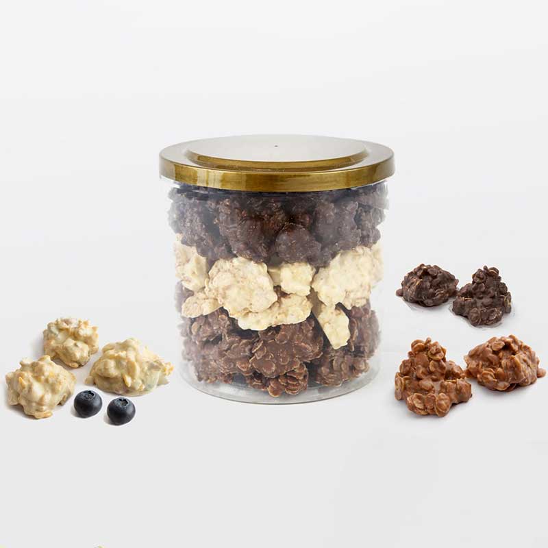 Cobertura con LECHE (azúcar, grasa vegetal de girasol y coco hidrogenado, cacao en polvo, LACTORUERO en polvo, emulgente: lecitina de SOJA y aroma), Chocolate blanco (azúcar, aceite y grasa vegetal (coco y girasol totalmente hidrogenados),LACTOSUERO en polvo, LECHE desnatada en polvo, emulgente: lecitina de SOJA y aromas), Cobertura chocolate negro (pasta de cacao, azúcar, manteca de cacao, emulgente: lecitina de SOJA y E-476, y aromas), PASAS, AVELLANAS, PIÑONES, ALMENDRA, arándanos y CEREALES (sémola de maíz, azúcar, ectracto de malta de CEBADA, harina de TRIGO (GLUTEN), y gasificante E-500). Puede contener trazas de otros FRUTOS de cáscara, HUEVO y SÉSAMO.
